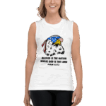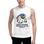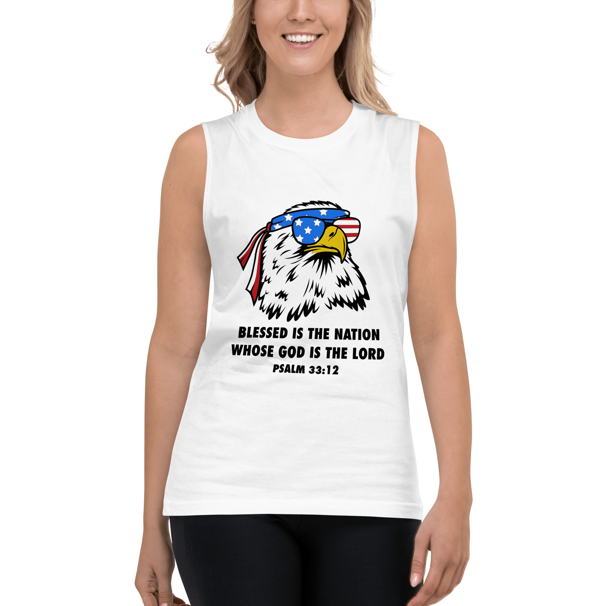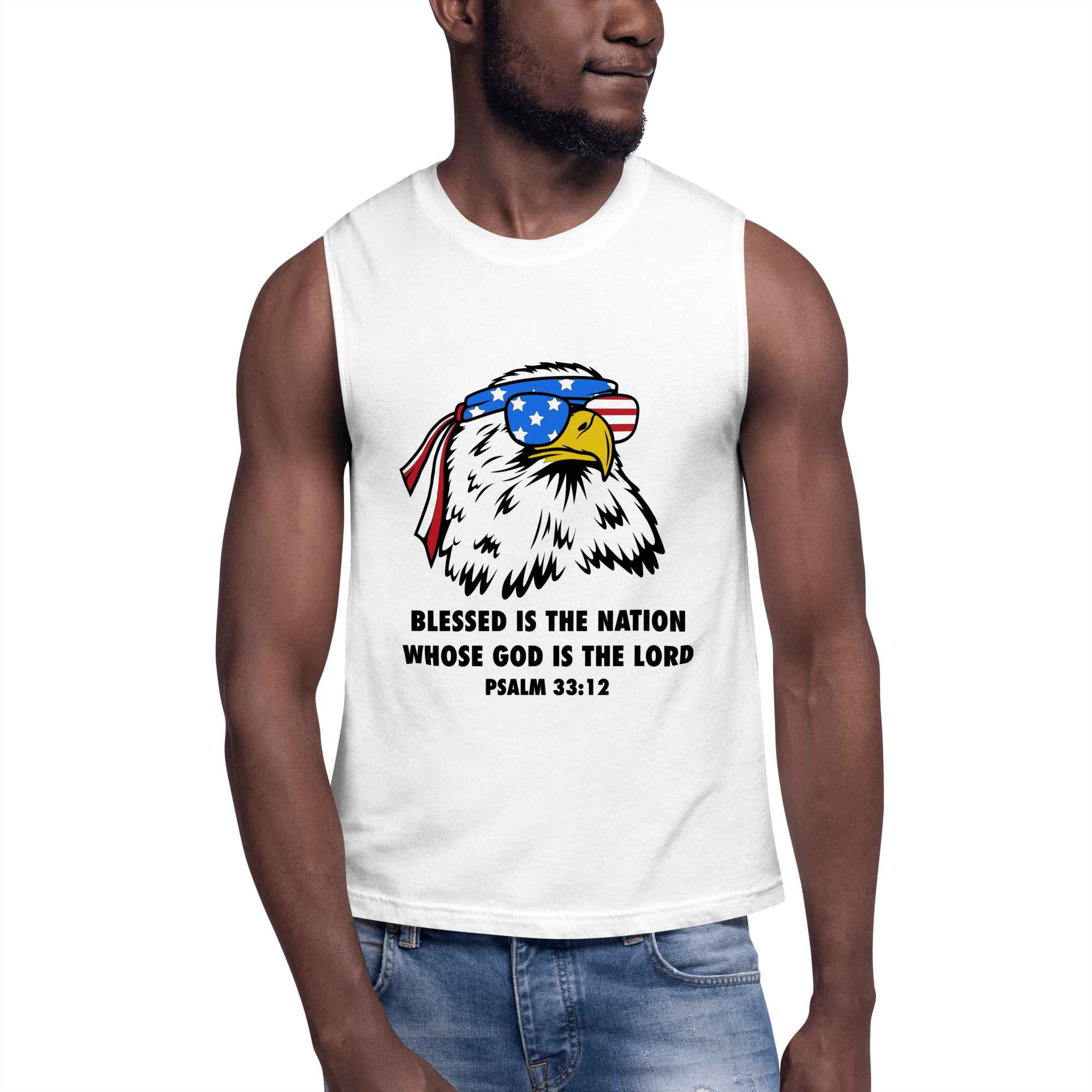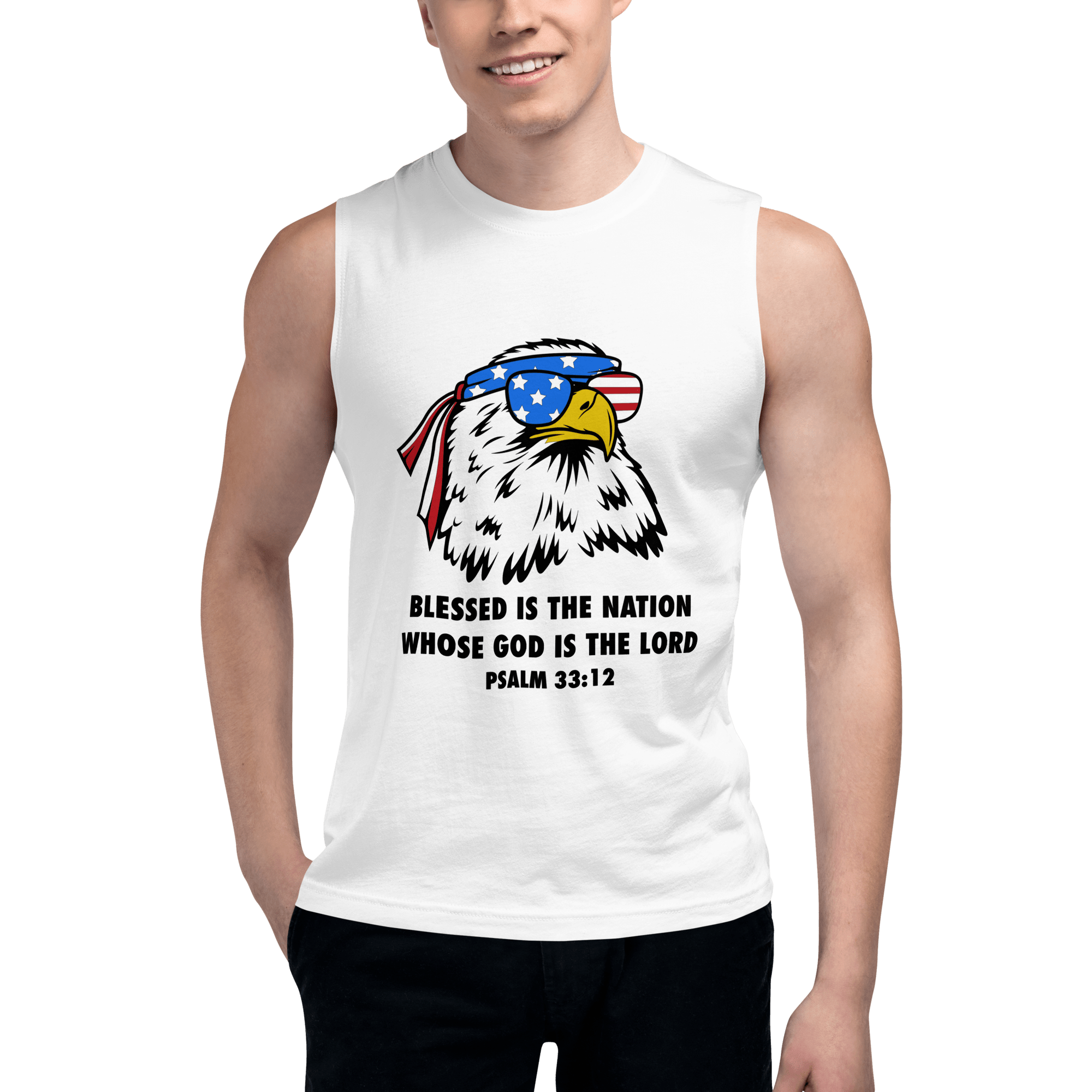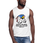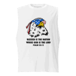Celebrate the strength of a nation under God with our Blessed Nation sleeveless shirt, featuring the powerful scripture “Blessed is the nation whose God is the Lord” – Psalm 33:12. Front and center is a striking graphic of a bald eagle—America’s proud symbol—rocking sunglasses and an American flag bandana, bringing a modern, fearless edge to a timeless truth.