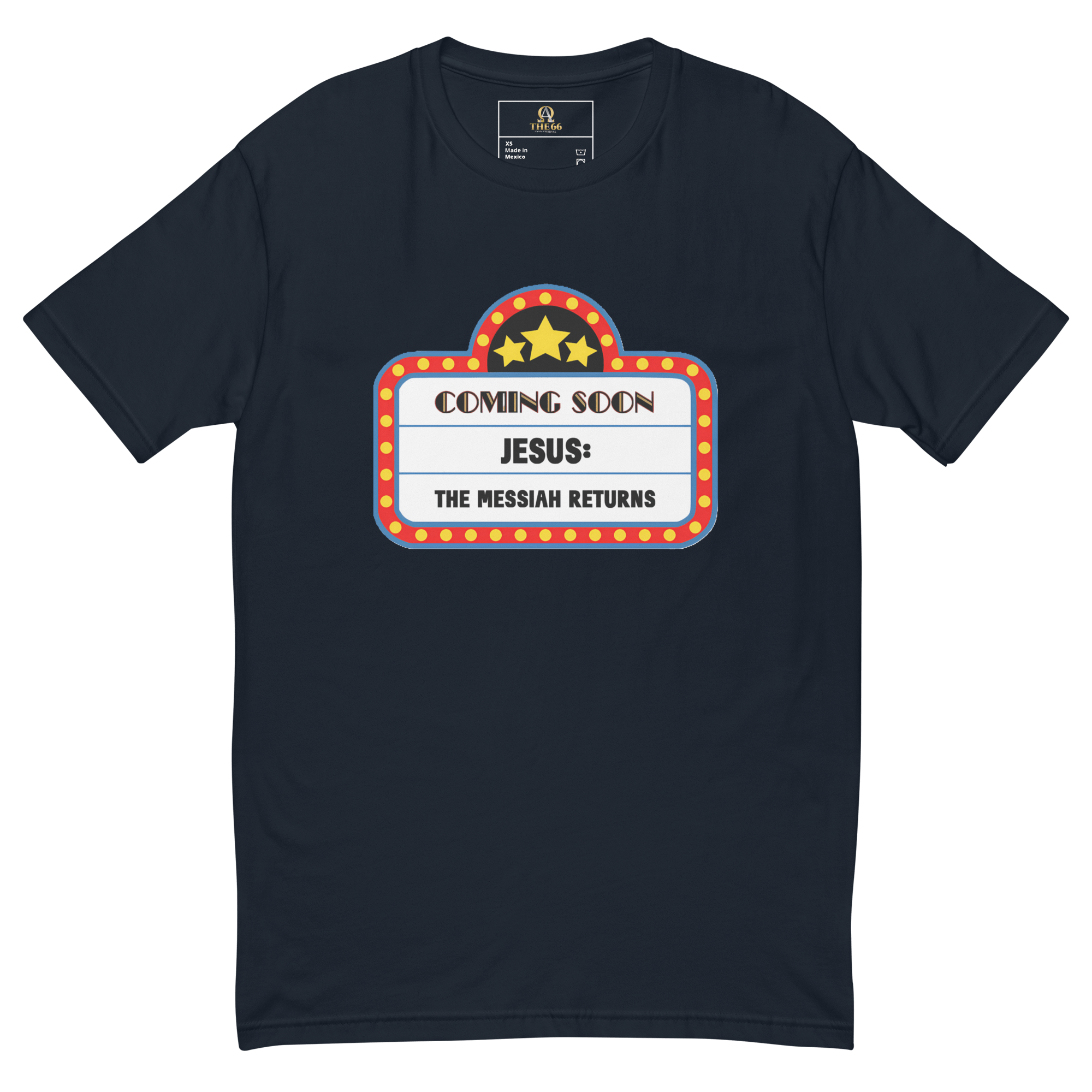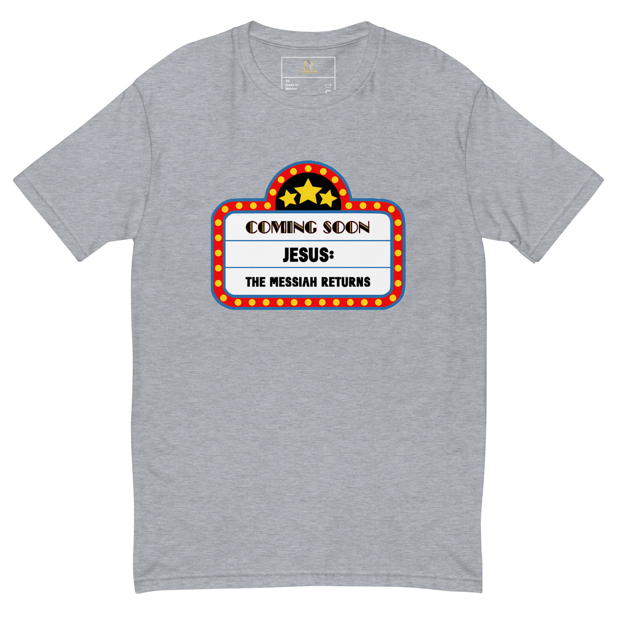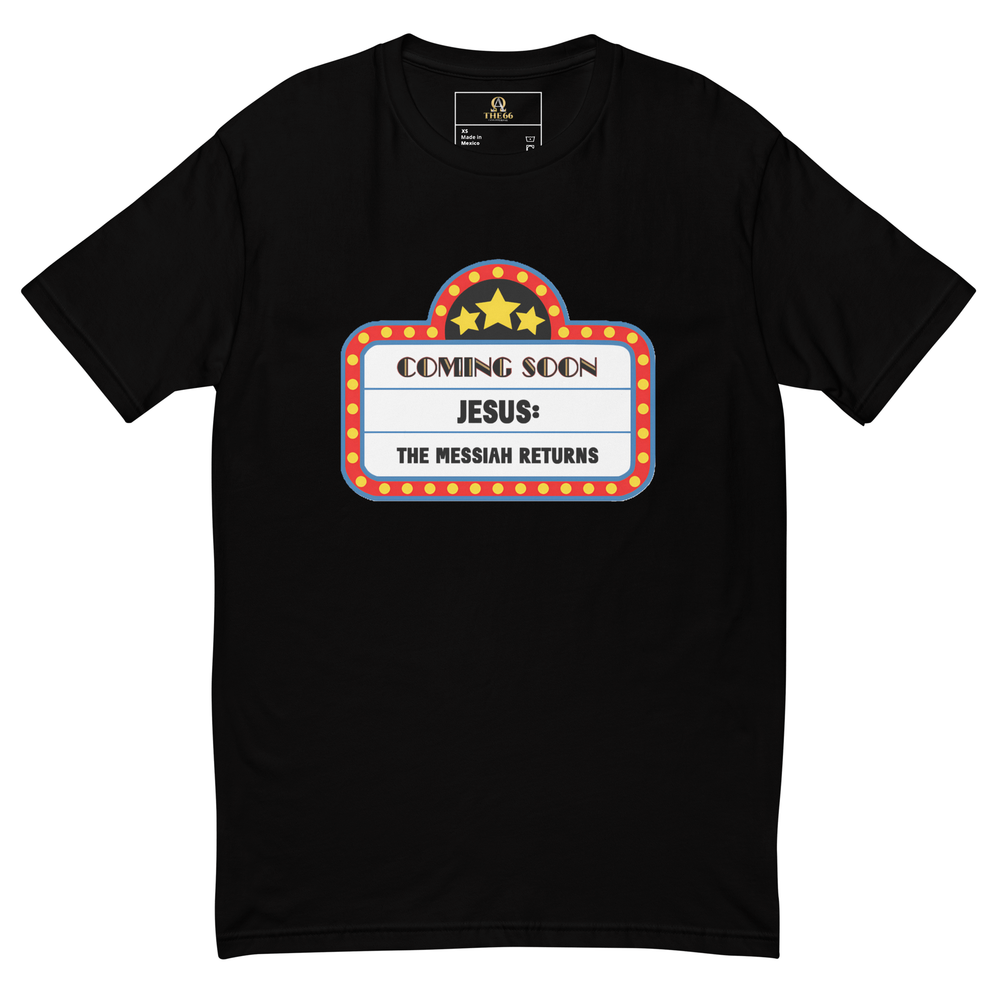 This bold and creative tee features a classic theater marquee sign with the headline: “COMING SOON” and the show-stopping title:“JESUS: The Messiah Returns”.