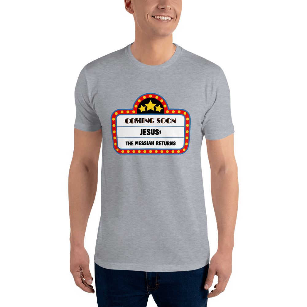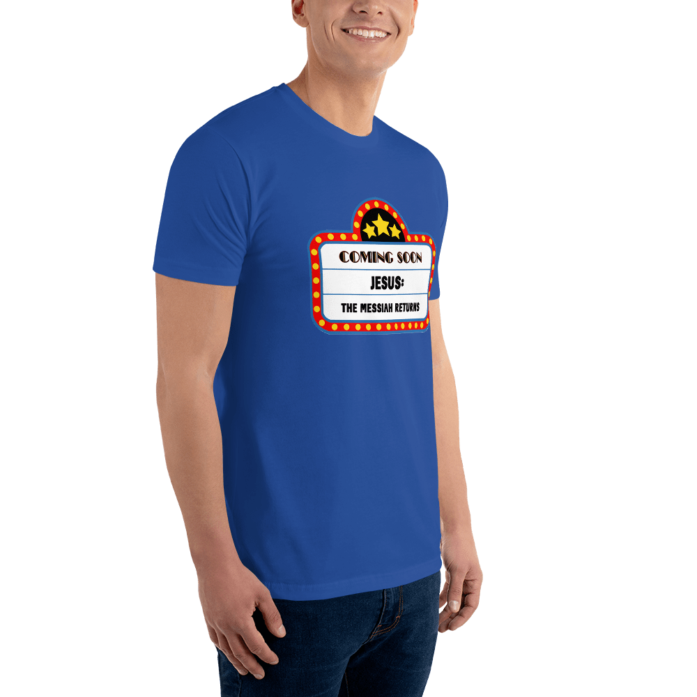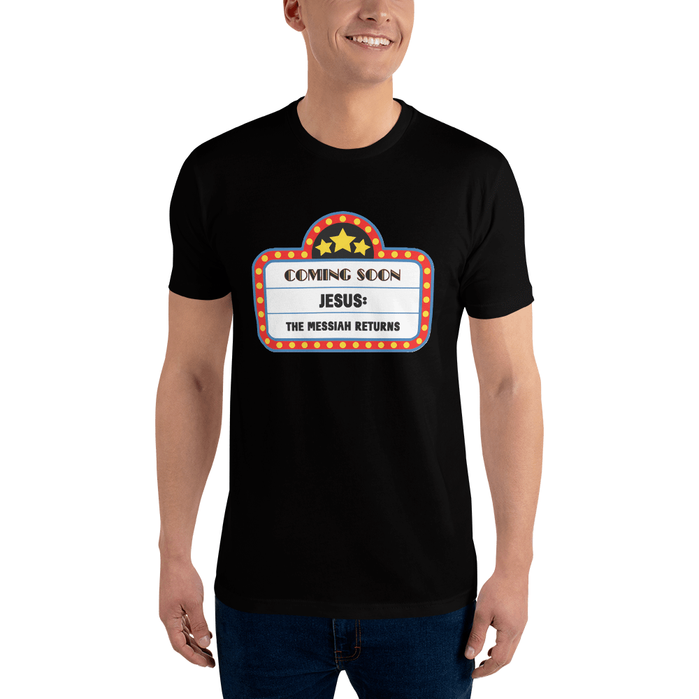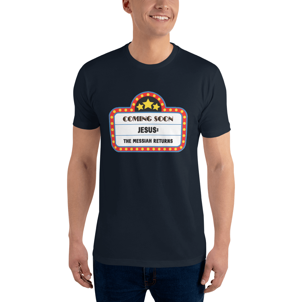 This bold and creative tee features a classic theater marquee sign with the headline: “COMING SOON” and the show-stopping title:“JESUS: The Messiah Returns”.