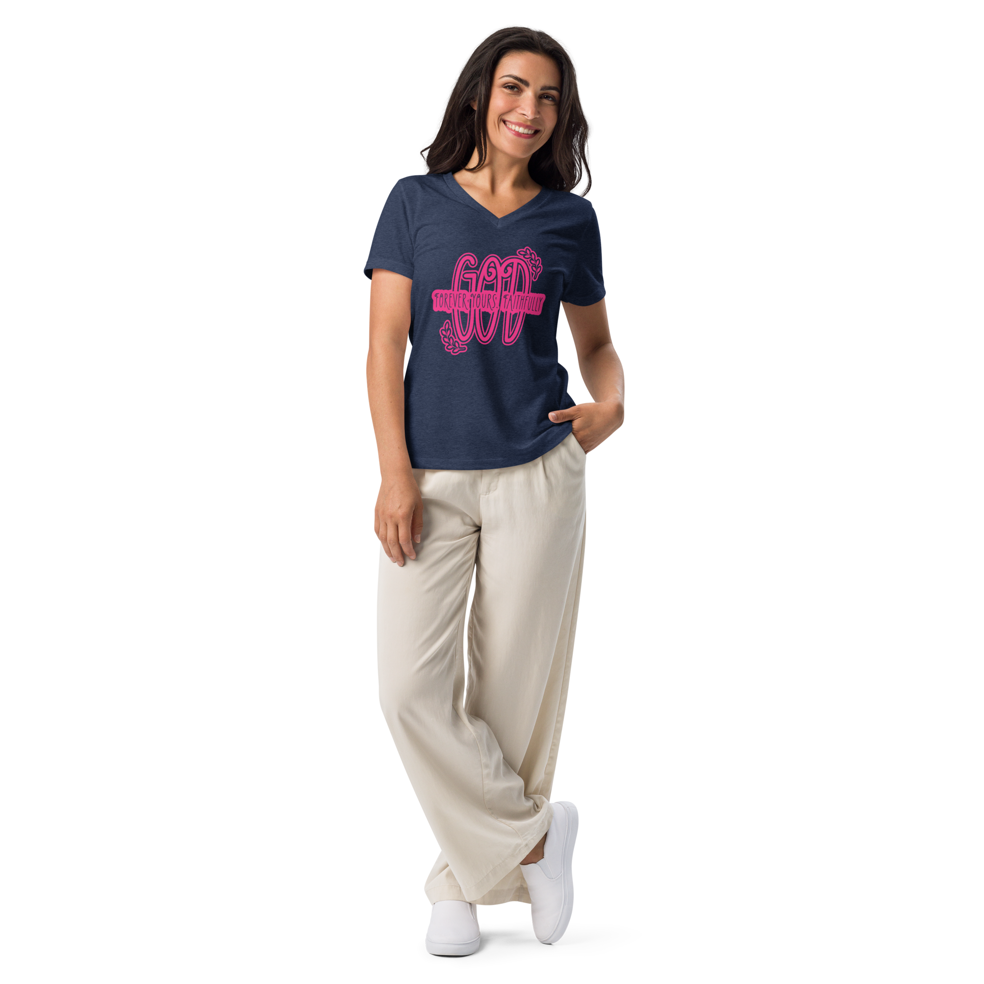 Our Forever Yours, Faithfully women’s V-neck tees is a soft, relaxed fit that beautifully expresses a heartfelt devotion to God. The elegant script of “Forever Yours, Faithfully” flows gracefully in front of the bold, centered word GOD, making this design both powerful and personal. It’s a quiet statement of trust, surrender, and unshakable faith.