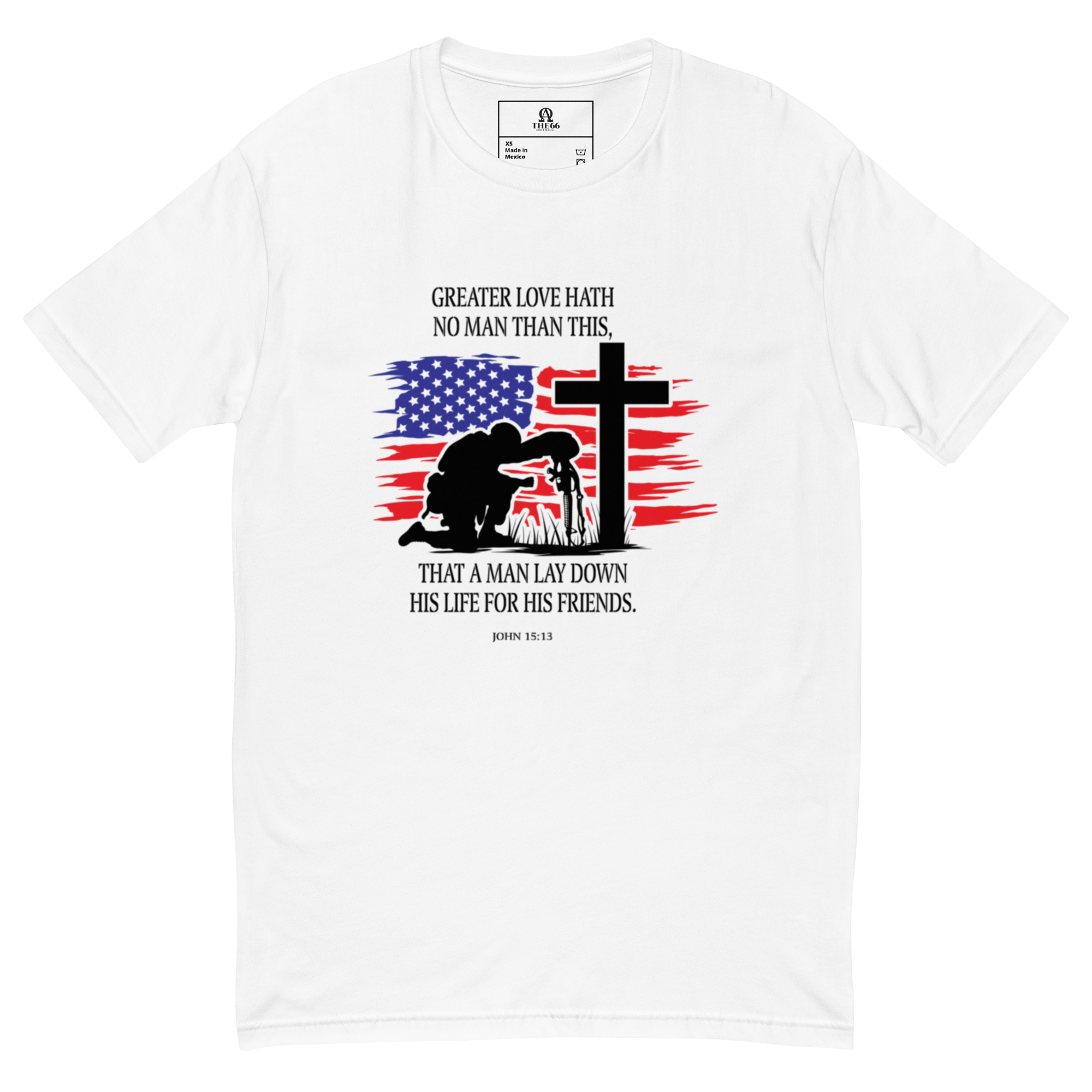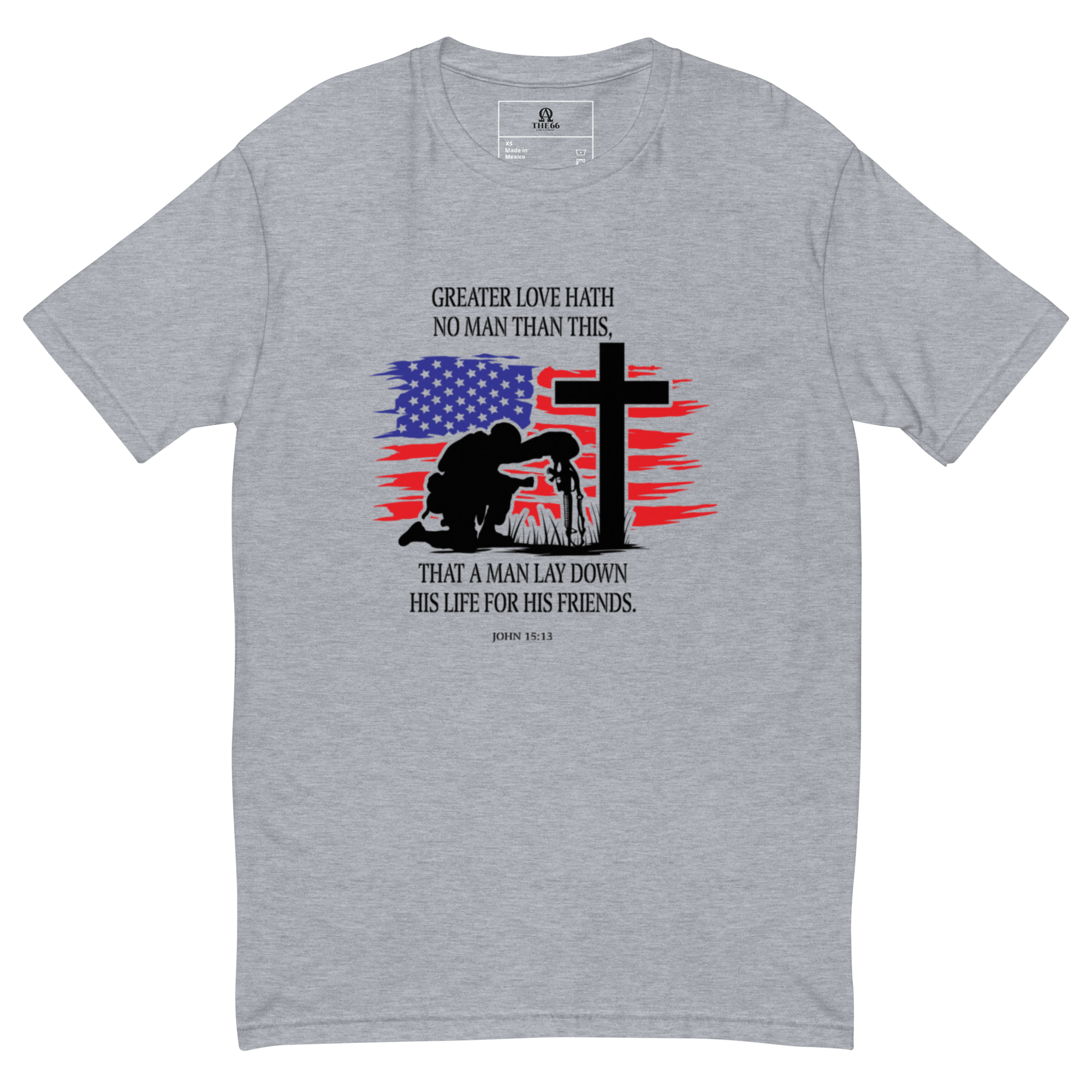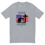 This powerful muscle shirt features the Bible verse John 15:13 – “Greater love hath no one than this, that a man lay down his life for his friends.” – boldly displayed alongside a striking design of an American flag and a soldier kneeling at a grave. It’s a heartfelt tribute to the men and women who gave everything in service to others.