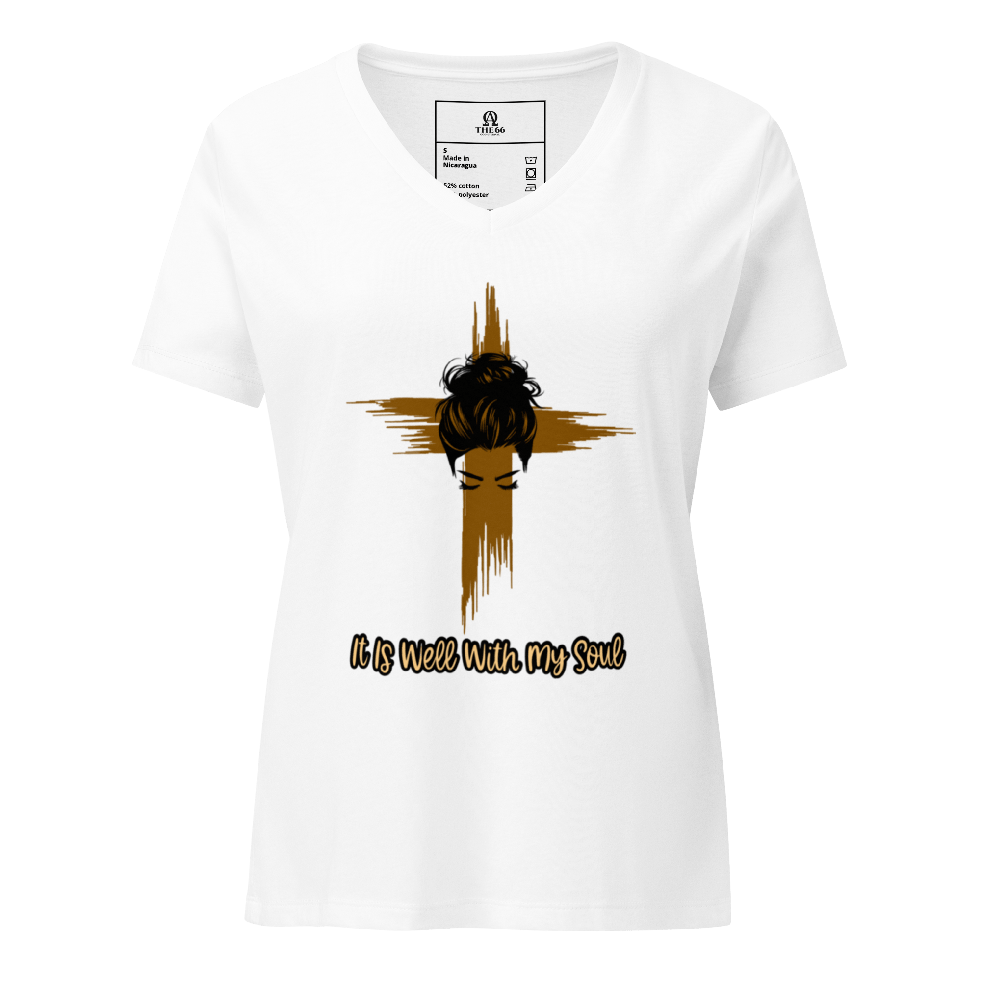 Our It Is Well With My Soul women’s V-Neck Tee is a soft, relaxed fit and features a beautiful and heartfelt design: a woman’s face bowed in quiet reverence over a cross symbol, symbolizing surrender, strength, and inner peace. The elegant script of the classic hymn lyric “It Is Well With My Soul” adds a timeless message of faith and calm in the midst of life’s storms.